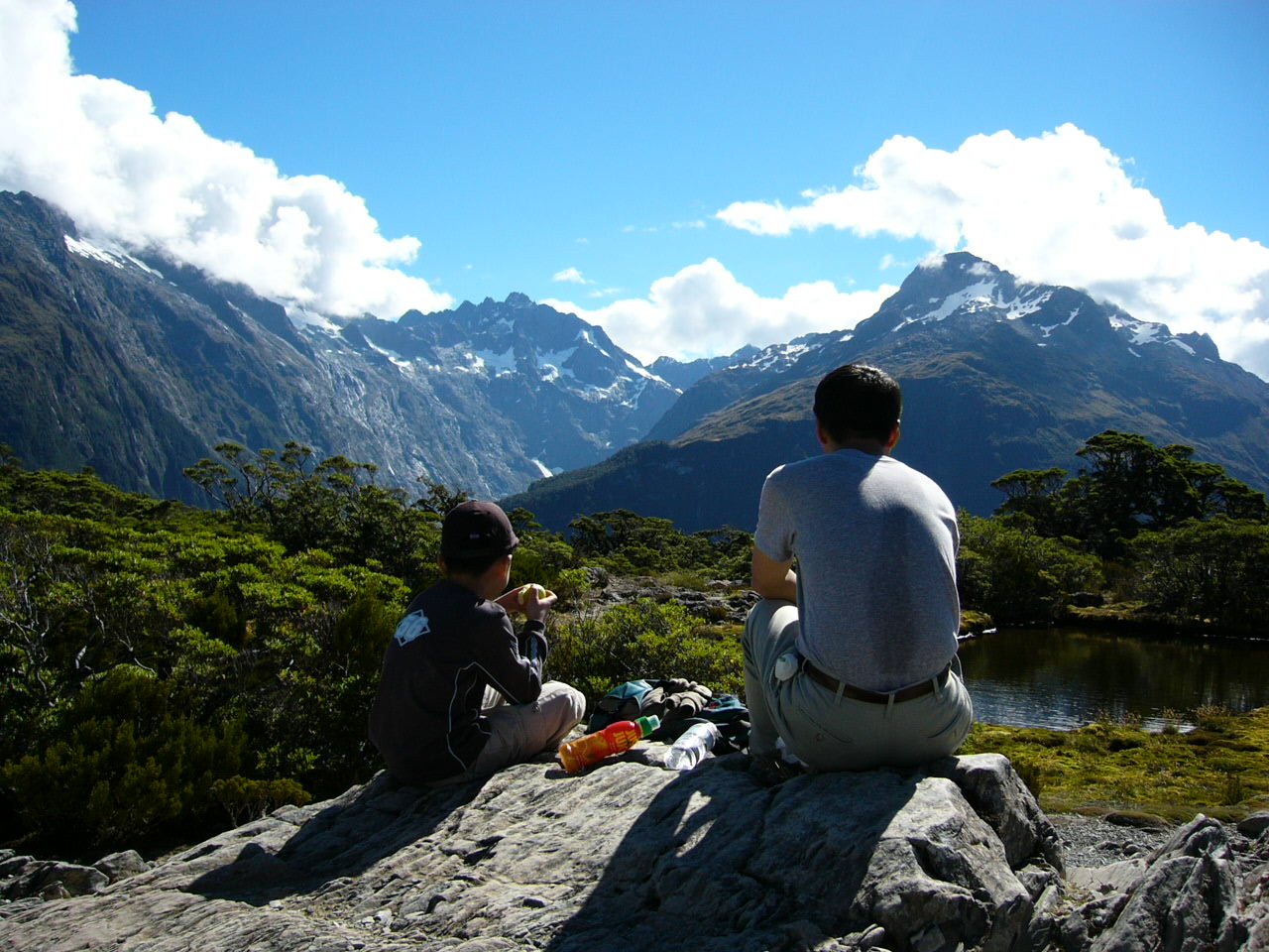 視界がわっと開けた。美しい山々。やった!頂上だ!3人で達成感を胸に、ミルフォードサウンドの売店で仕入れたサンドイッチやりんごをほおばった。そこに日本人の女性が一人やってきた。ワーキングホリデービザで旅をしているそうだ。日本人のワーキングホリデービザの人達の中で、「絶対に食べよう」という食べ物が3つあるんだそうで、テカポのサーモン丼、どこかのチーズケーキにもう一つは何だっけ?行く前にワーホリ経験があった知人からその話はちらっと聞いていたもので、そんな話で盛り上がった。